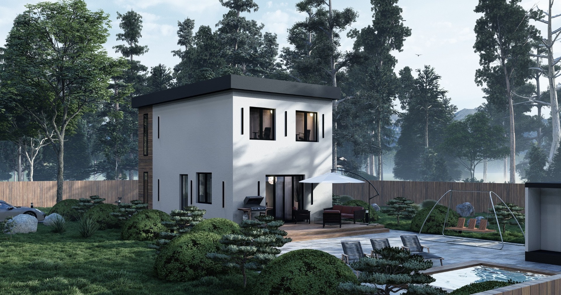 Фундамент + стены + крыша + окна + двери + техническая лестница